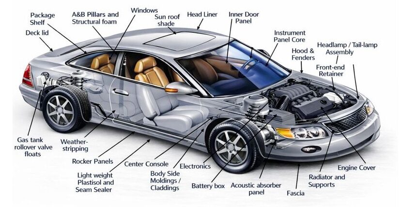 PP Compounded Parts: HVAC cases, bumpers, radiator grills, fan shrouds, seat panels, interior door trims.